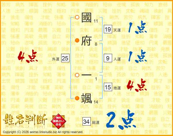 生活面を象徴する運勢です。外部から受ける影響力を表し、結婚運、家庭運や職場、環境への順応性を表します。総運から人運を引いた画数。姓や名が1文字の場合を除く。