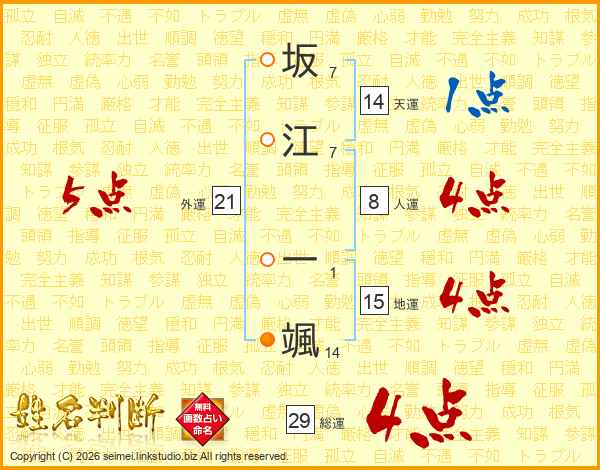 坂江一颯さんの総運は29画の4点!
