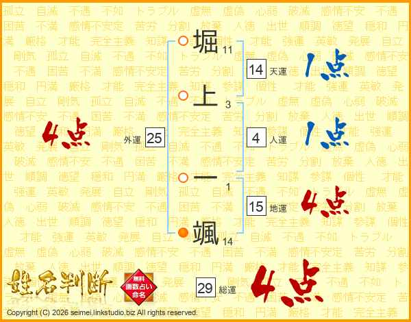 生活面を象徴する運勢です。外部から受ける影響力を表し、結婚運、家庭運や職場、環境への順応性を表します。総運から人運を引いた画数。姓や名が1文字の場合を除く。