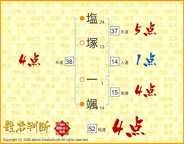 塩(24画)塚(13画) 一(1画)颯(14画)
