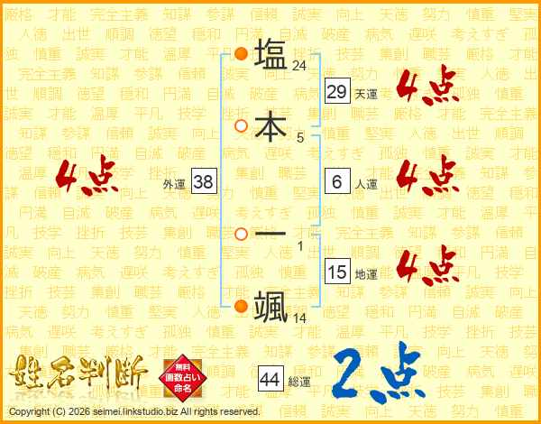 生活面を象徴する運勢です。外部から受ける影響力を表し、結婚運、家庭運や職場、環境への順応性を表します。総運から人運を引いた画数。姓や名が1文字の場合を除く。