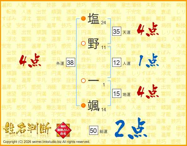 生活面を象徴する運勢です。外部から受ける影響力を表し、結婚運、家庭運や職場、環境への順応性を表します。総運から人運を引いた画数。姓や名が1文字の場合を除く。