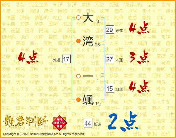 生活面を象徴する運勢です。外部から受ける影響力を表し、結婚運、家庭運や職場、環境への順応性を表します。総運から人運を引いた画数。姓や名が1文字の場合を除く。