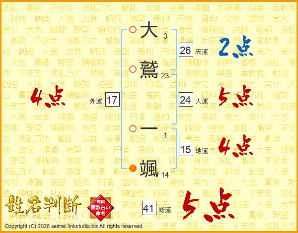 大(3画)鷲(23画) 一(1画)颯(14画)