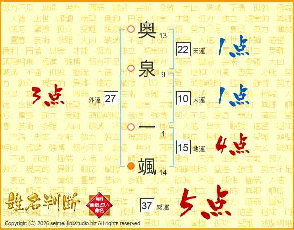 奥泉一颯さんの総運は37画の5点!