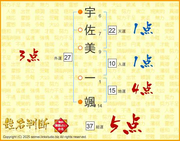宇(6画)佐(7画)美(9画) 一(1画)颯(14画)