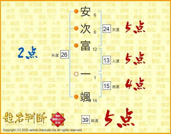 安(6画)次(6画)富(12画) 一(1画)颯(14画)