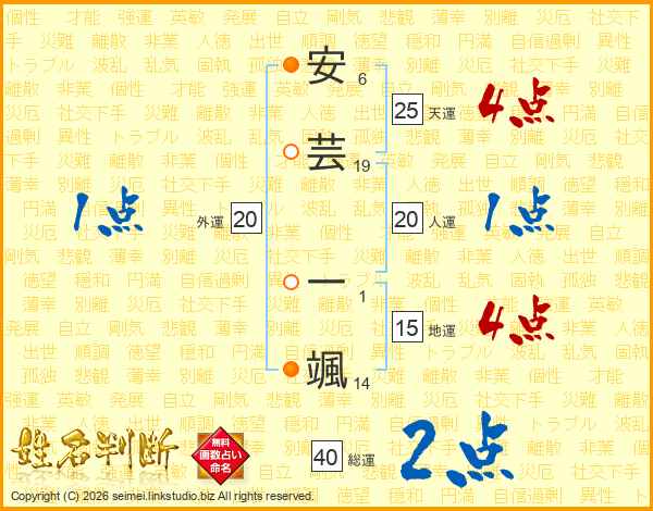 生活面を象徴する運勢です。外部から受ける影響力を表し、結婚運、家庭運や職場、環境への順応性を表します。総運から人運を引いた画数。姓や名が1文字の場合を除く。
