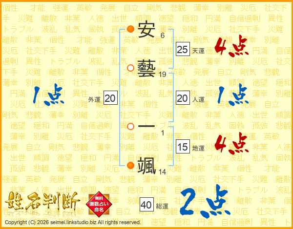 生活面を象徴する運勢です。外部から受ける影響力を表し、結婚運、家庭運や職場、環境への順応性を表します。総運から人運を引いた画数。姓や名が1文字の場合を除く。