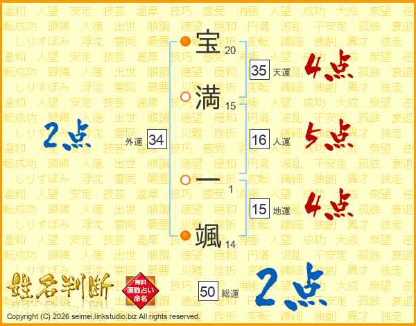 宝(20画)満(15画) 一(1画)颯(14画)