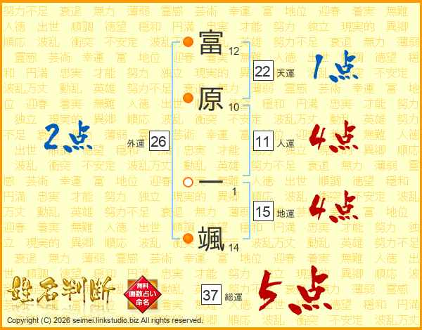 生活面を象徴する運勢です。外部から受ける影響力を表し、結婚運、家庭運や職場、環境への順応性を表します。総運から人運を引いた画数。姓や名が1文字の場合を除く。