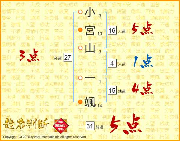 小宮山一颯さんの総運は31画の5点!