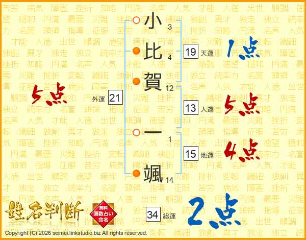 小(3画)比(4画)賀(12画) 一(1画)颯(14画)