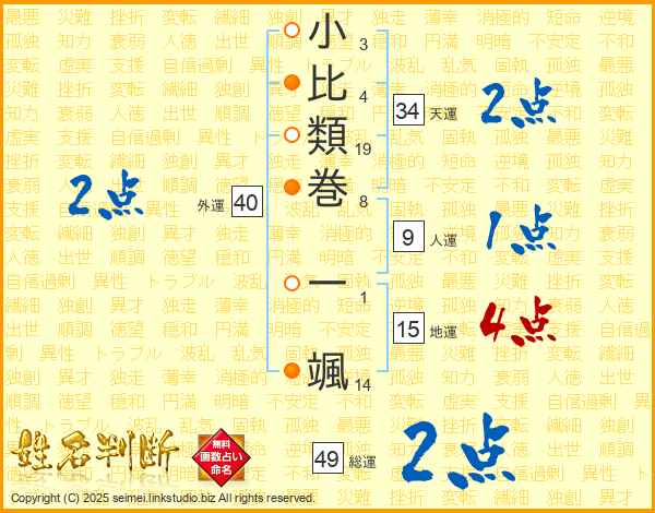 小(3画)比(4画)類(19画)巻(8画) 一(1画)颯(14画)