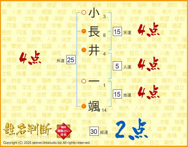 小(3画)長(8画)井(4画) 一(1画)颯(14画)