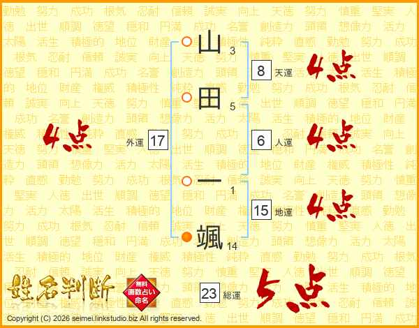 生活面を象徴する運勢です。外部から受ける影響力を表し、結婚運、家庭運や職場、環境への順応性を表します。総運から人運を引いた画数。姓や名が1文字の場合を除く。