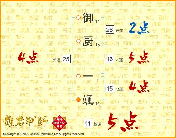 生活面を象徴する運勢です。外部から受ける影響力を表し、結婚運、家庭運や職場、環境への順応性を表します。総運から人運を引いた画数。姓や名が1文字の場合を除く。