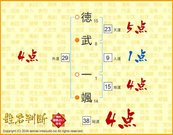 生活面を象徴する運勢です。外部から受ける影響力を表し、結婚運、家庭運や職場、環境への順応性を表します。総運から人運を引いた画数。姓や名が1文字の場合を除く。