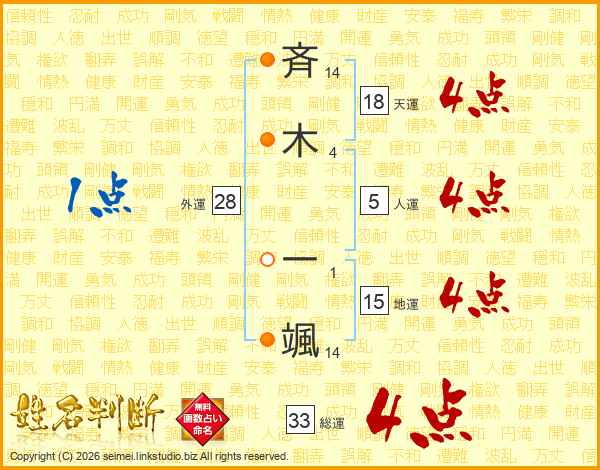 斉木一颯さんの総運は33画の4点!