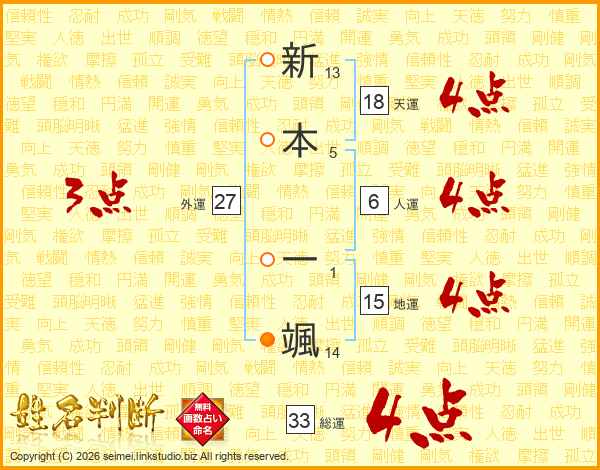 あなたの人生を表す1番重要な運勢です。生涯を通じて影響する総合運となり、主に50歳以降の晩年期に影響を及ぼします。苗字と名前の合計画数。