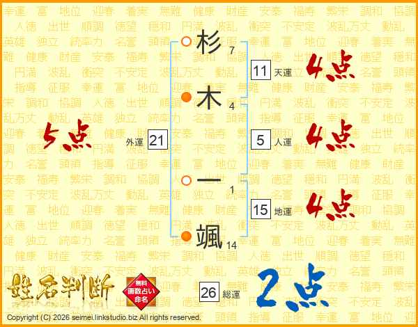 生活面を象徴する運勢です。外部から受ける影響力を表し、結婚運、家庭運や職場、環境への順応性を表します。総運から人運を引いた画数。姓や名が1文字の場合を除く。