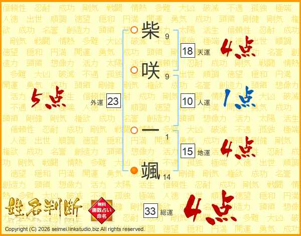 柴(9画)咲(9画) 一(1画)颯(14画)