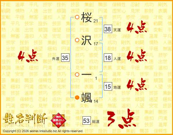 桜(21画)沢(17画) 一(1画)颯(14画)
