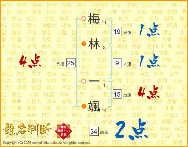 梅(11画)林(8画) 一(1画)颯(14画)
