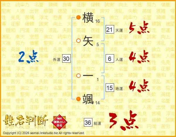 横矢一颯さんの天運は21画の5点!