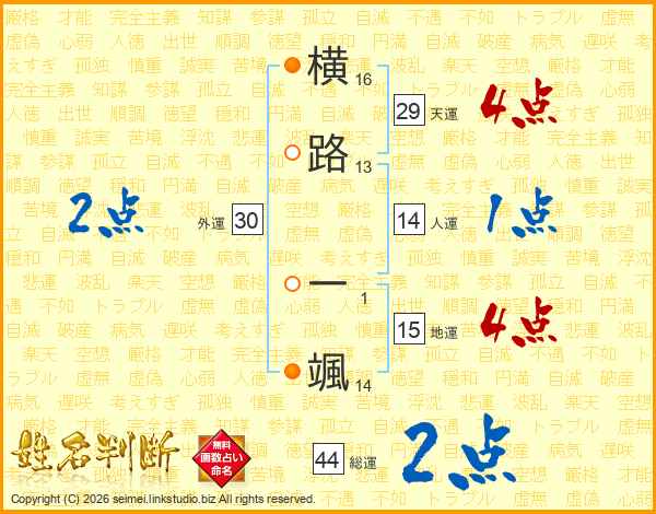 生活面を象徴する運勢です。外部から受ける影響力を表し、結婚運、家庭運や職場、環境への順応性を表します。総運から人運を引いた画数。姓や名が1文字の場合を除く。