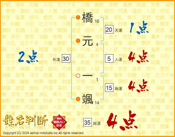 橋(16画)元(4画) 一(1画)颯(14画)