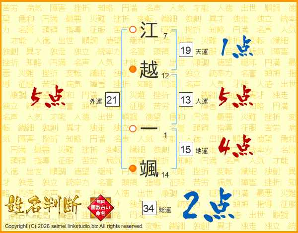 生活面を象徴する運勢です。外部から受ける影響力を表し、結婚運、家庭運や職場、環境への順応性を表します。総運から人運を引いた画数。姓や名が1文字の場合を除く。
