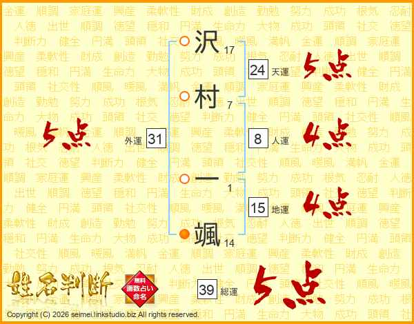 沢村一颯さんの総運は39画の5点!