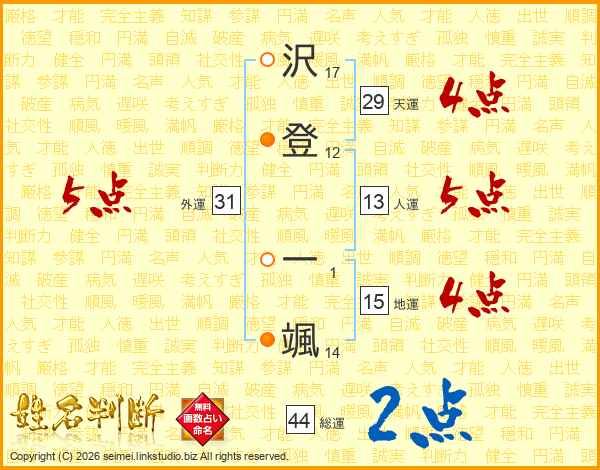 生活面を象徴する運勢です。外部から受ける影響力を表し、結婚運、家庭運や職場、環境への順応性を表します。総運から人運を引いた画数。姓や名が1文字の場合を除く。