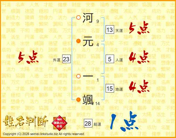 生活面を象徴する運勢です。外部から受ける影響力を表し、結婚運、家庭運や職場、環境への順応性を表します。総運から人運を引いた画数。姓や名が1文字の場合を除く。