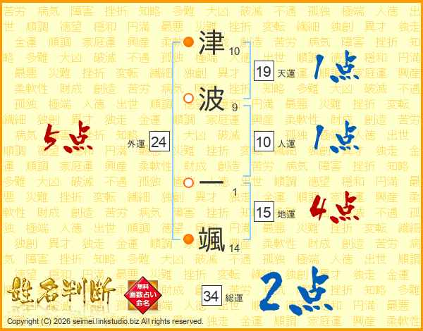 生活面を象徴する運勢です。外部から受ける影響力を表し、結婚運、家庭運や職場、環境への順応性を表します。総運から人運を引いた画数。姓や名が1文字の場合を除く。