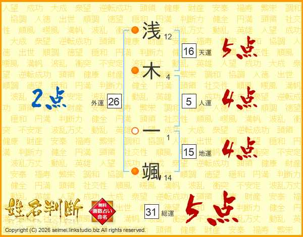 生活面を象徴する運勢です。外部から受ける影響力を表し、結婚運、家庭運や職場、環境への順応性を表します。総運から人運を引いた画数。姓や名が1文字の場合を除く。