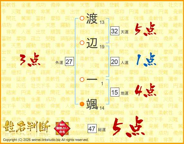 渡(13画)辺(19画) 一(1画)颯(14画)