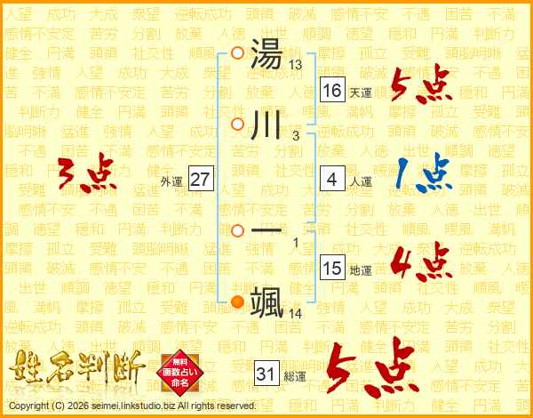 生活面を象徴する運勢です。外部から受ける影響力を表し、結婚運、家庭運や職場、環境への順応性を表します。総運から人運を引いた画数。姓や名が1文字の場合を除く。