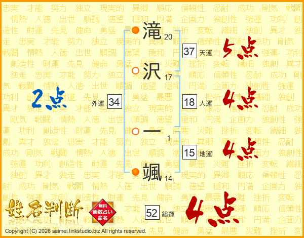 滝(20画)沢(17画) 一(1画)颯(14画)