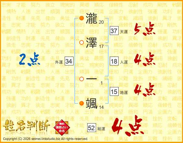 瀧(20画)澤(17画) 一(1画)颯(14画)