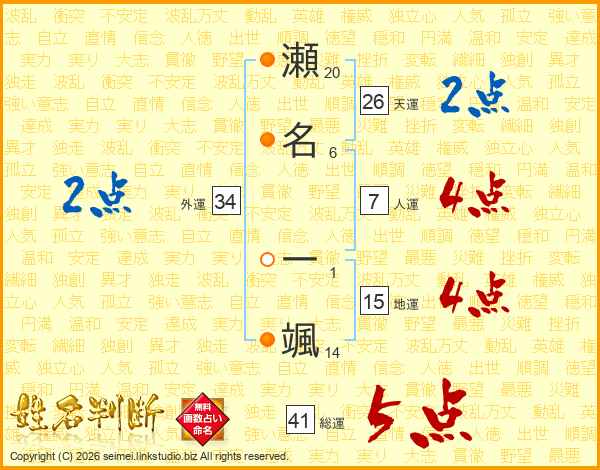 瀬名一颯さんの総運は41画の5点!