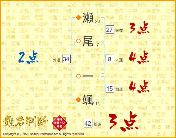 瀬(20画)尾(7画) 一(1画)颯(14画)