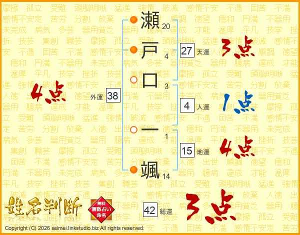 瀬(20画)戸(4画)口(3画) 一(1画)颯(14画)