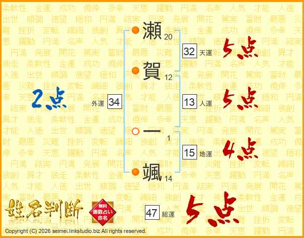 瀬賀一颯さんの総運は47画の5点!
