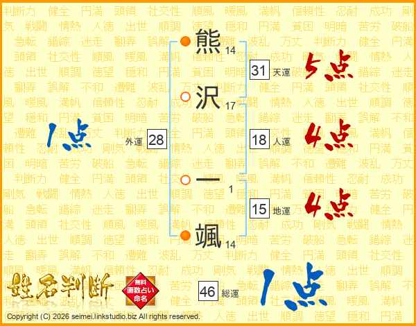 熊沢一颯さんの総運は46画の1点!