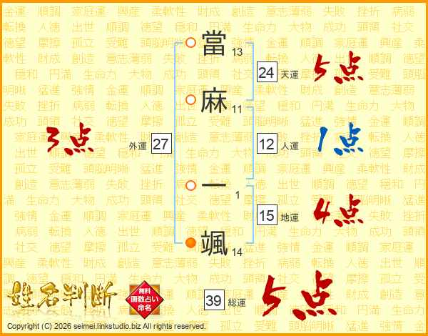 當麻一颯さんの総運は39画の5点!