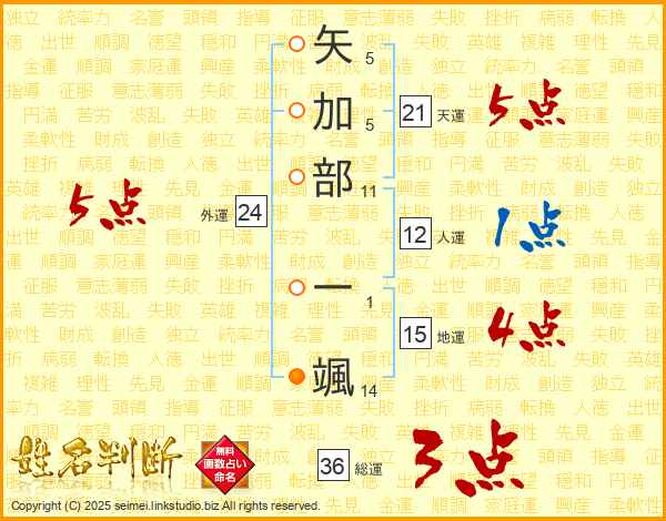 生活面を象徴する運勢です。外部から受ける影響力を表し、結婚運、家庭運や職場、環境への順応性を表します。総運から人運を引いた画数。姓や名が1文字の場合を除く。