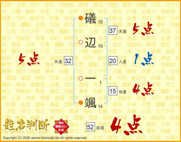 生活面を象徴する運勢です。外部から受ける影響力を表し、結婚運、家庭運や職場、環境への順応性を表します。総運から人運を引いた画数。姓や名が1文字の場合を除く。