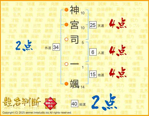 神(10画)宮(10画)司(5画) 一(1画)颯(14画)